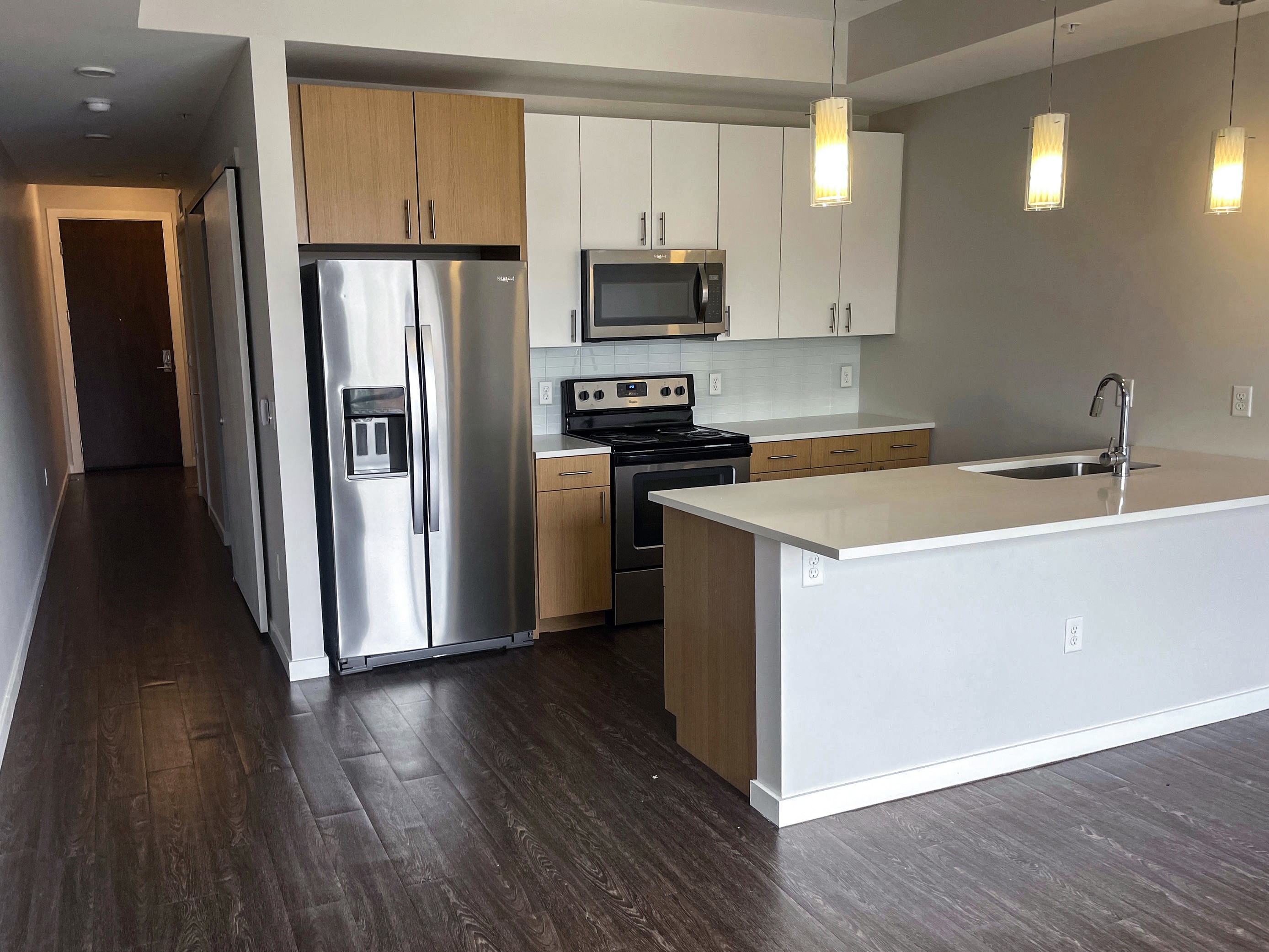 Bright, open space with stainless steel appliances, quartz or slate countertops, and wood-style flooring. In‑unit washer & dryer, AC, and a private balcony/patio—great for morning coffee or evening wind-downs. Spa‑style bathrooms and walk‑in closets (in select layouts).