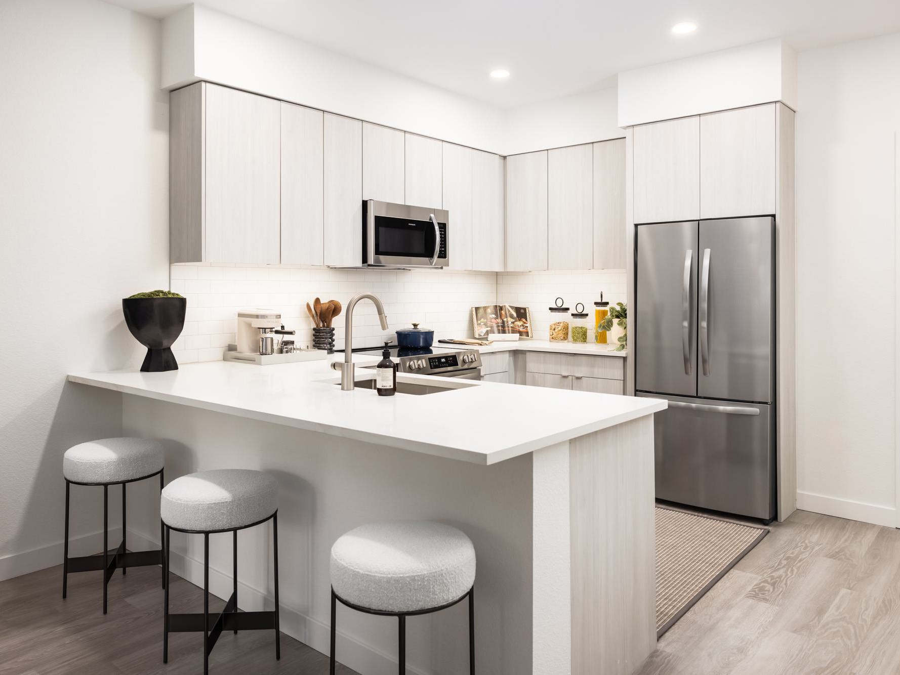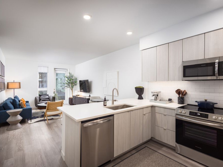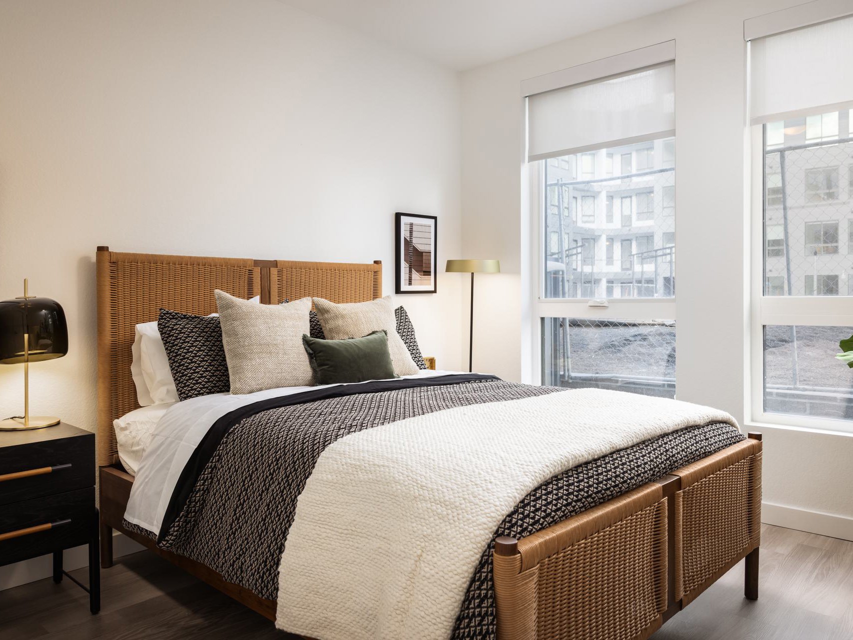 This apartment features an open-concept layout with floor-to-ceiling windows, a gourmet kitchen with stainless steel appliances and quartz countertops, in-unit laundry, & smart home technology with keyless entry.