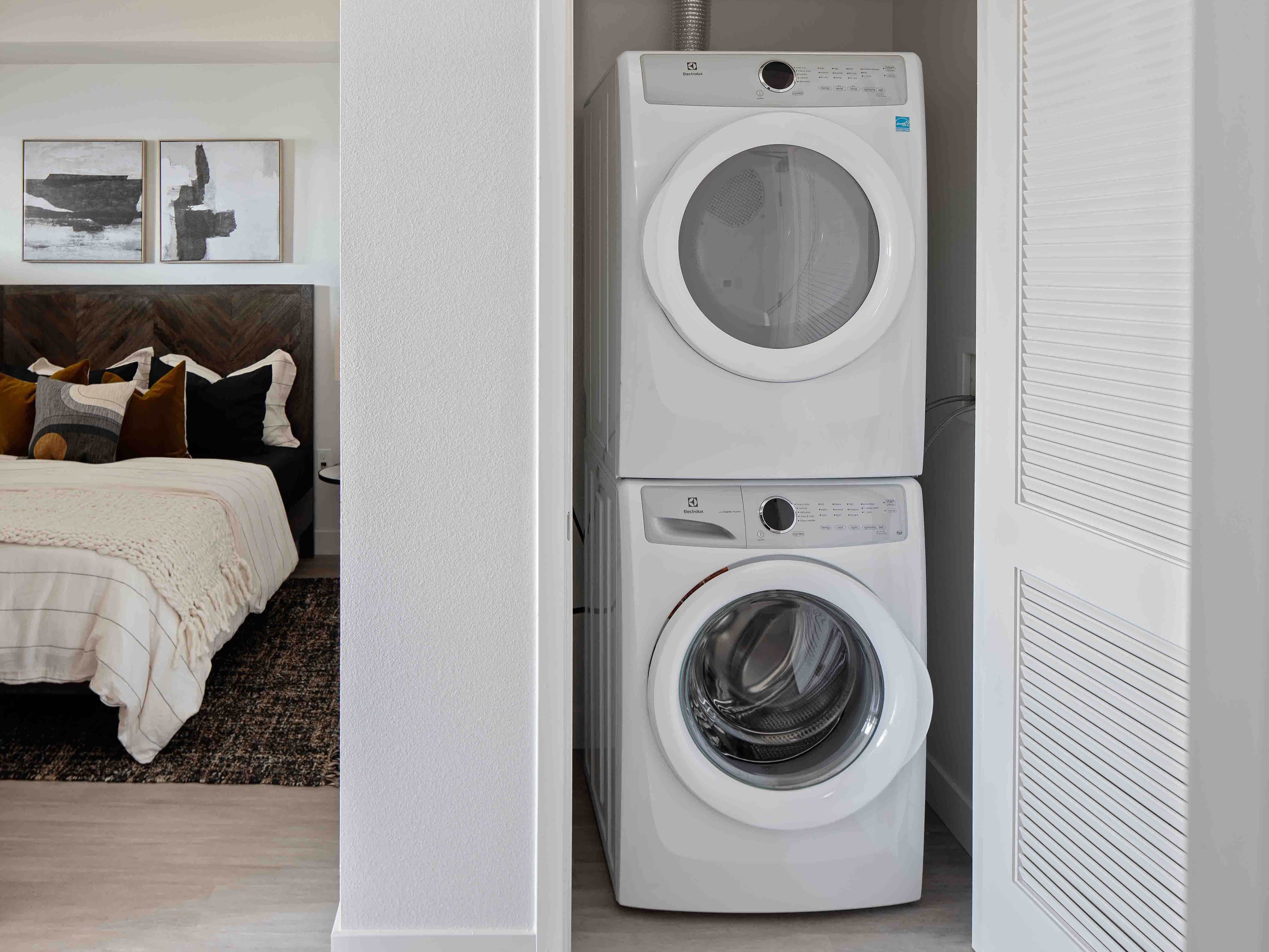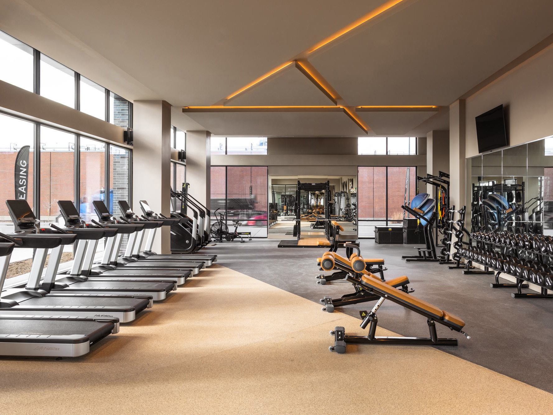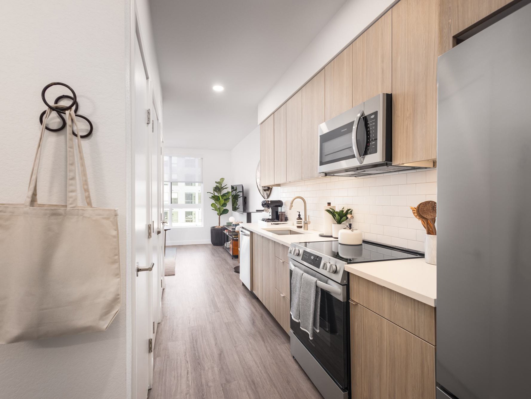 This apartment features an open-concept layout with floor-to-ceiling windows, a gourmet kitchen with stainless steel appliances and quartz countertops, in-unit laundry, & smart home technology with keyless entry.