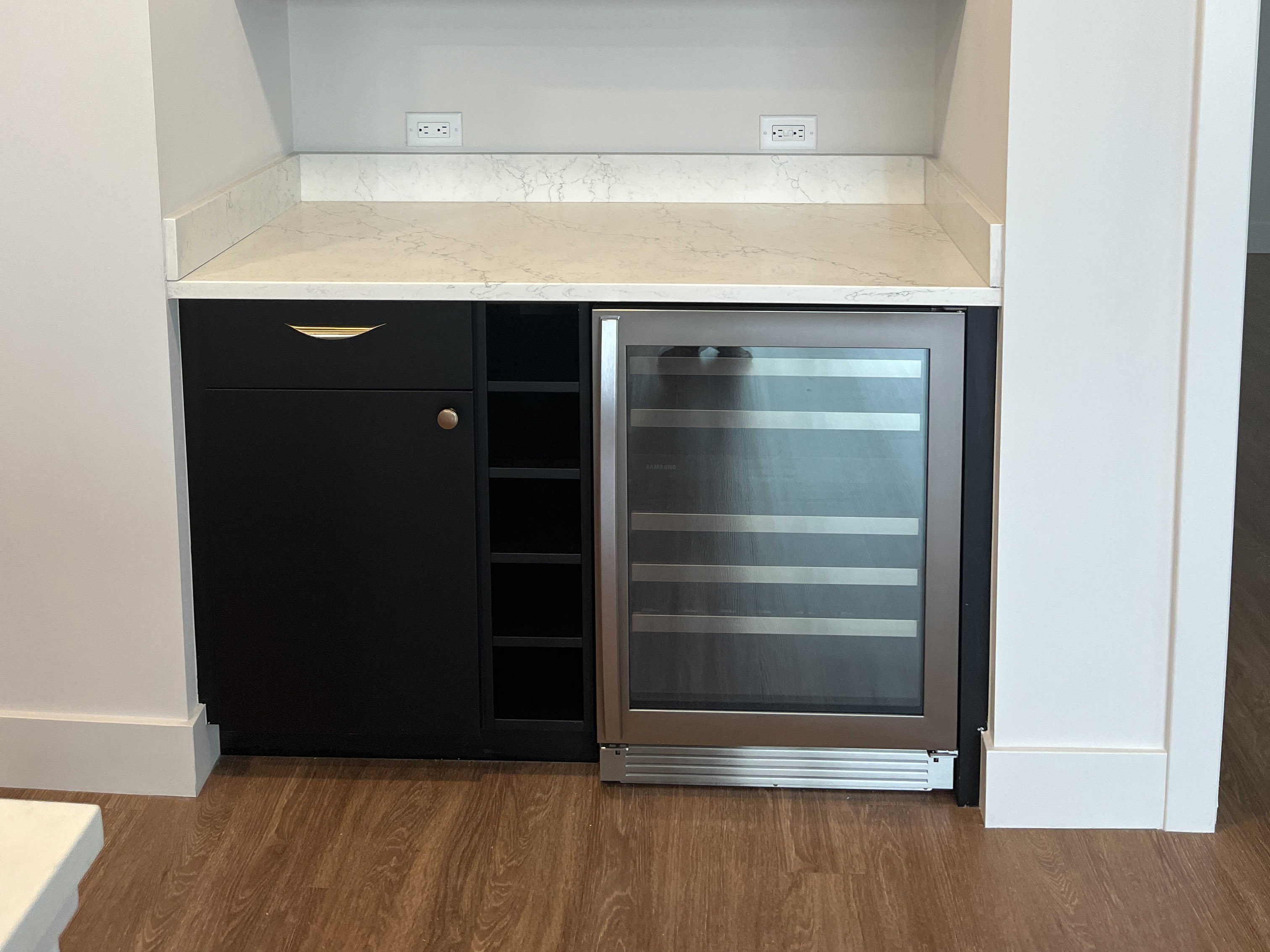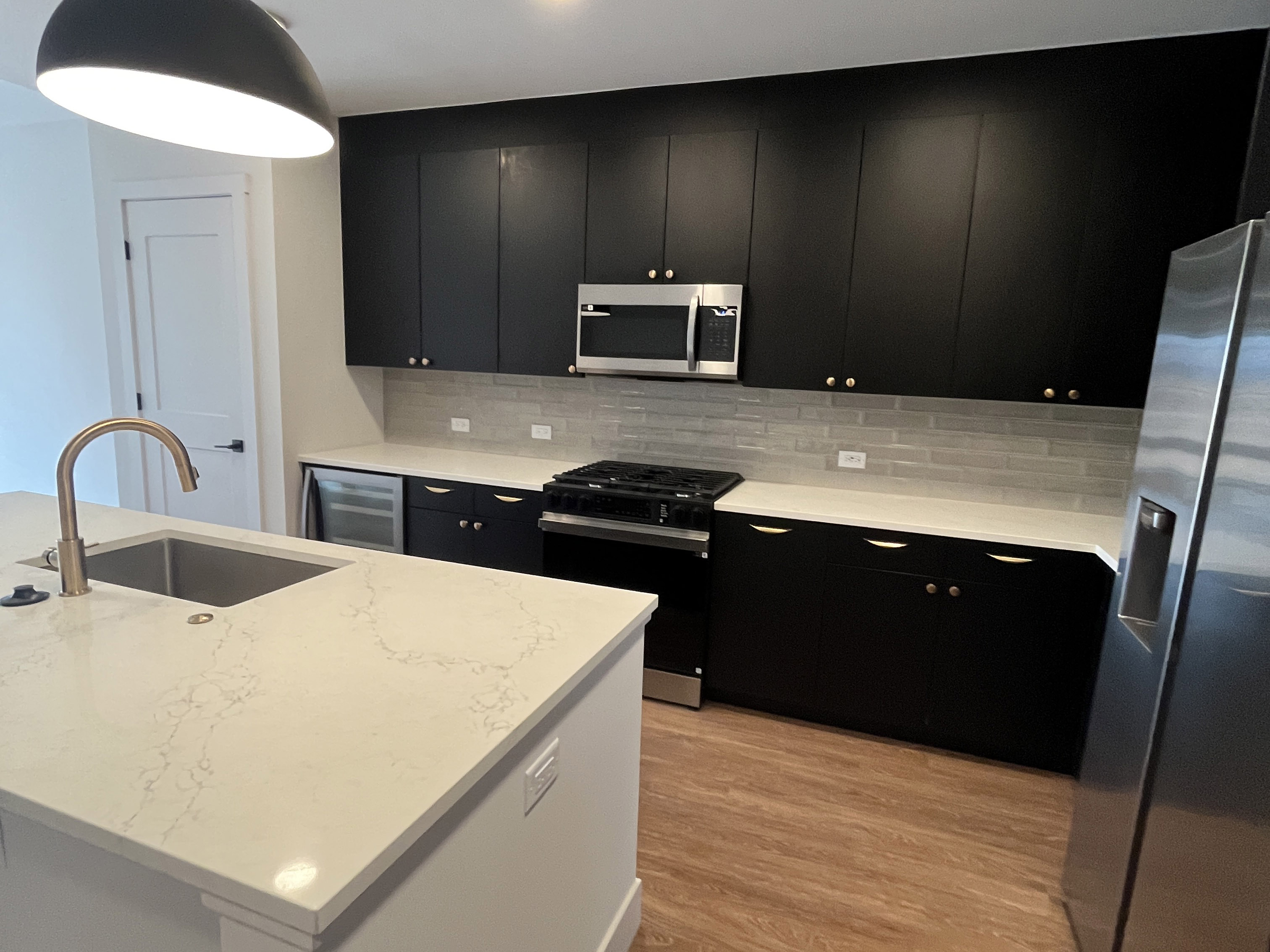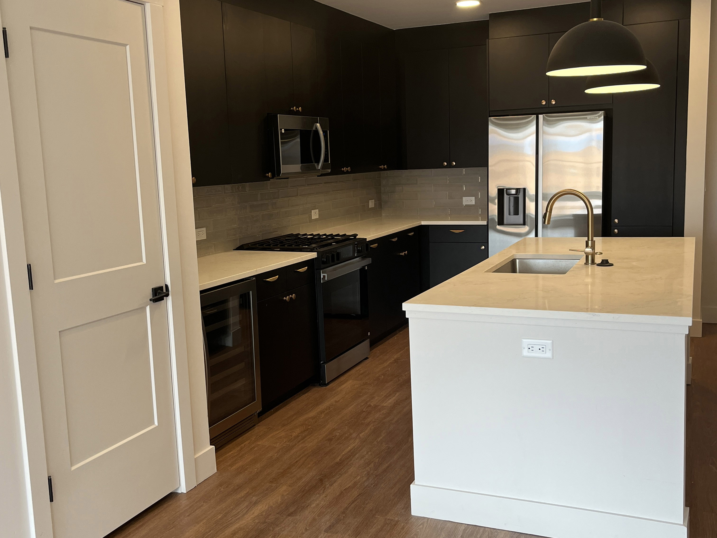 This living space contains an open-concept layout with high ceilings and large windows for tons of natural light. The modern kitchen features stainless steel appliances and quartz countertops. There's also in-unit laundry and smart home features!
