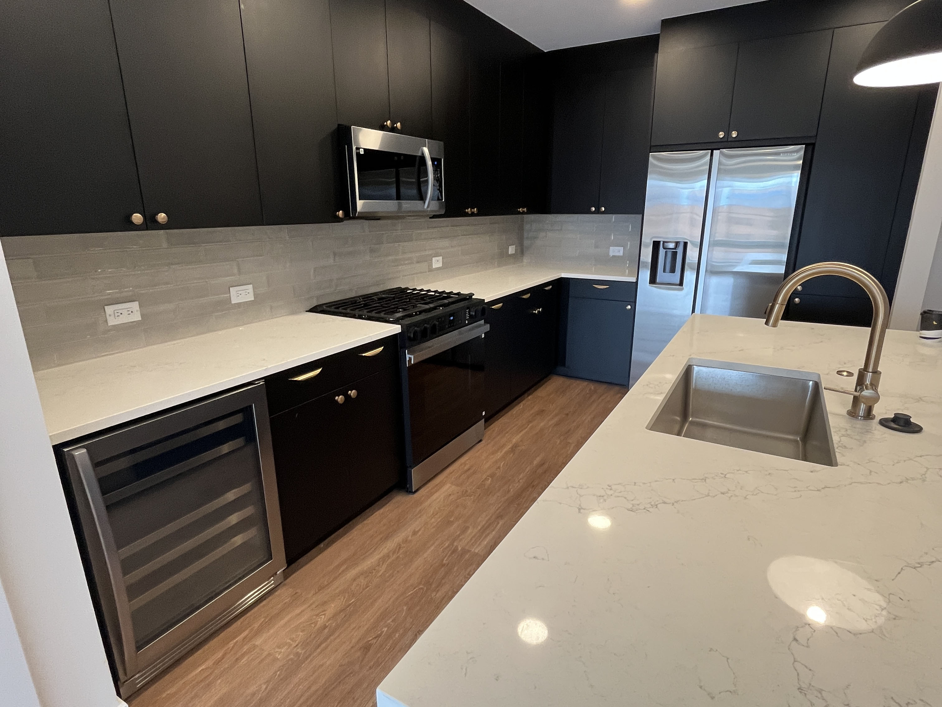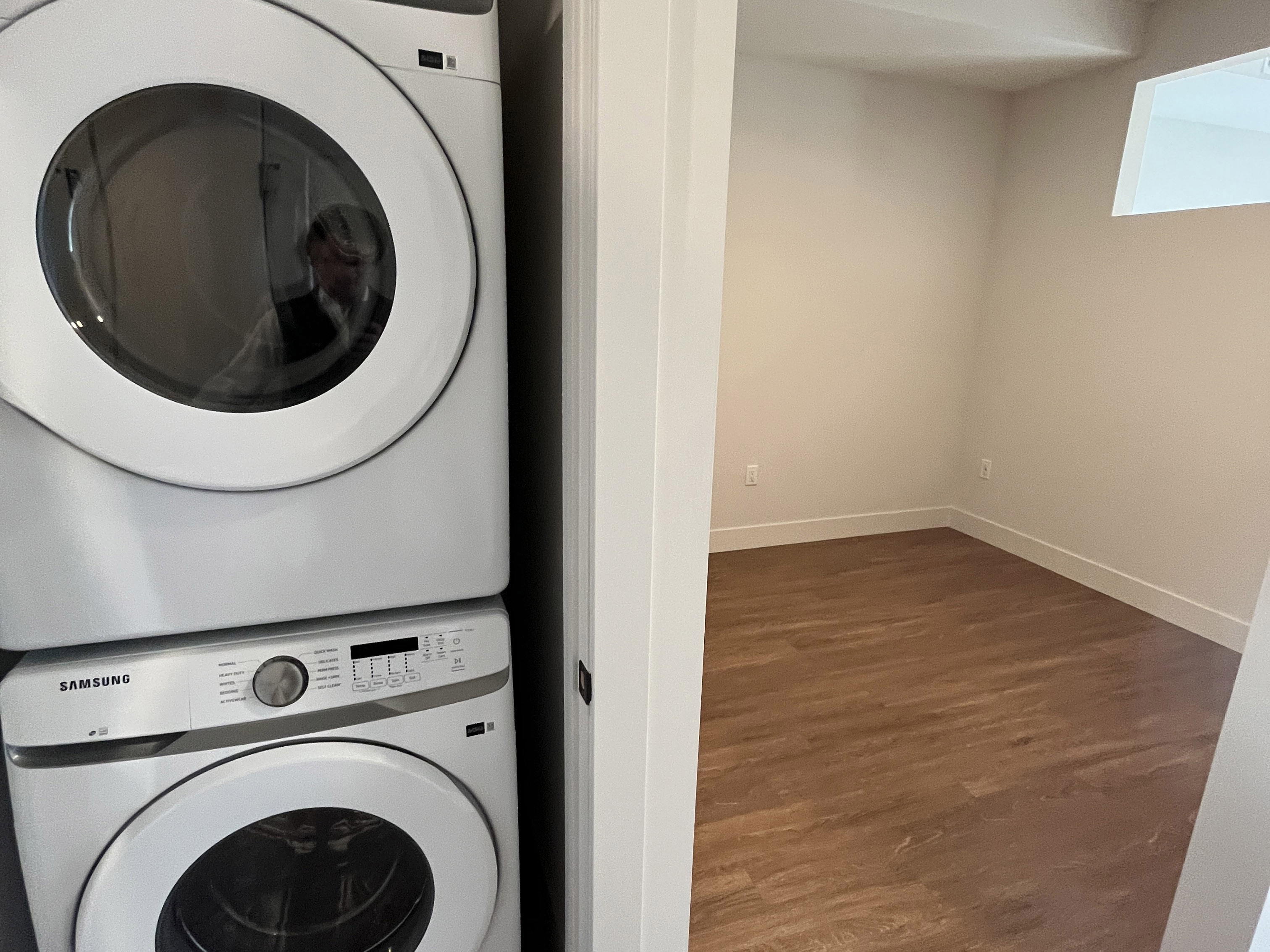 This living space contains an open-concept layout with high ceilings and large windows for tons of natural light. The modern kitchen features stainless steel appliances and quartz countertops. There's also in-unit laundry and smart home features!