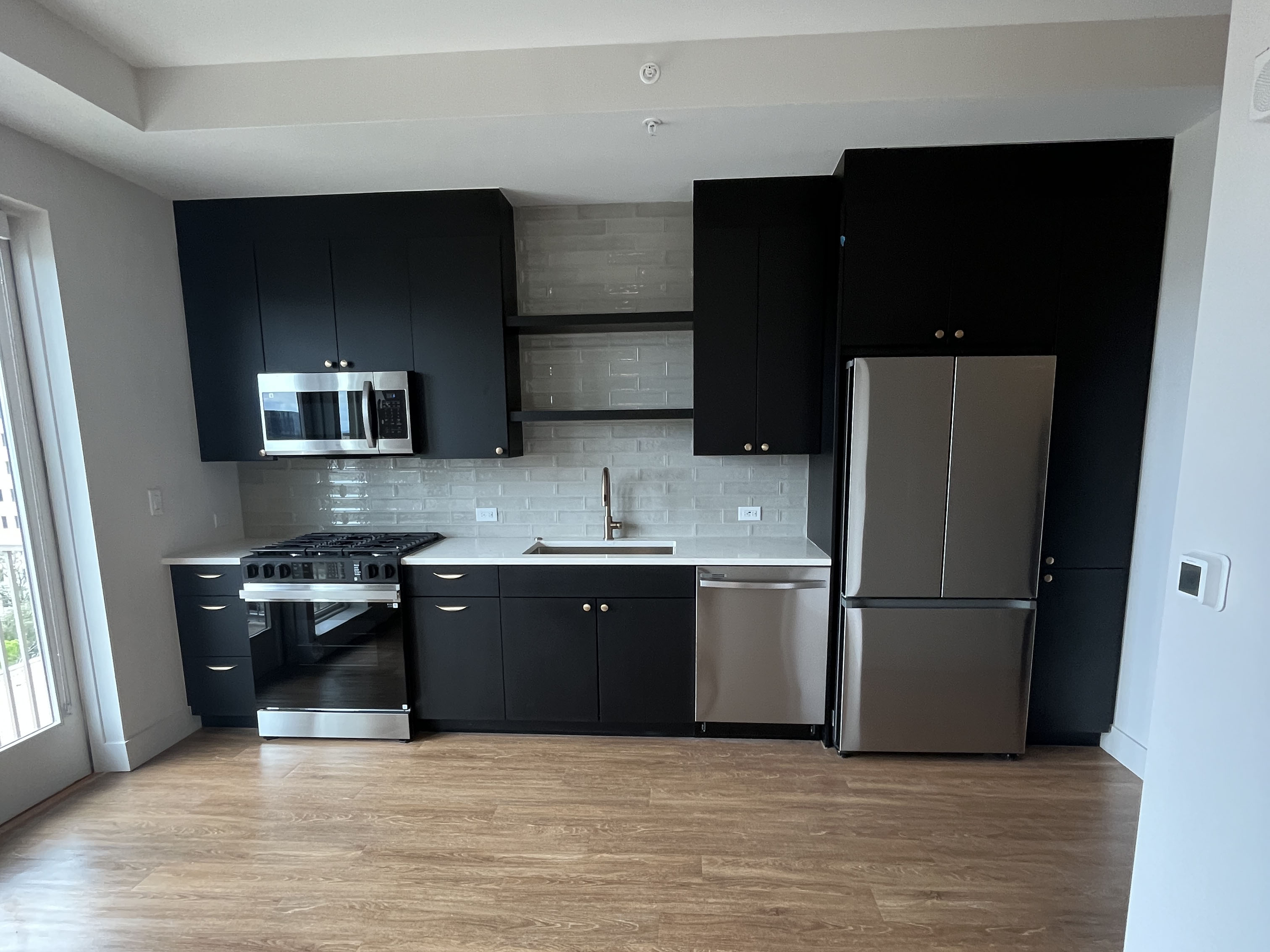 This living space contains an open-concept layout with high ceilings and large windows for tons of natural light. The modern kitchen features stainless steel appliances and quartz countertops. There's also in-unit laundry and smart home features!