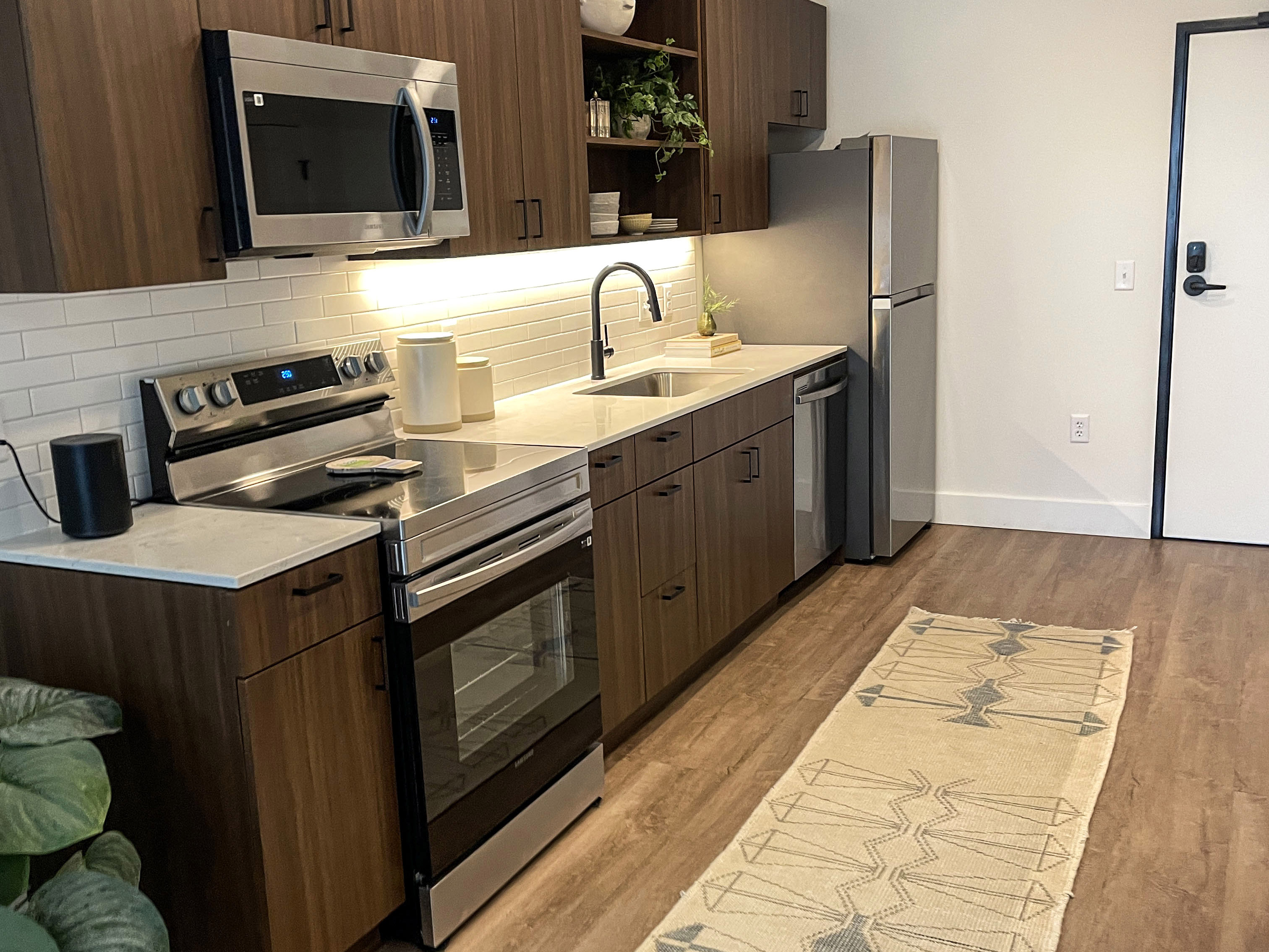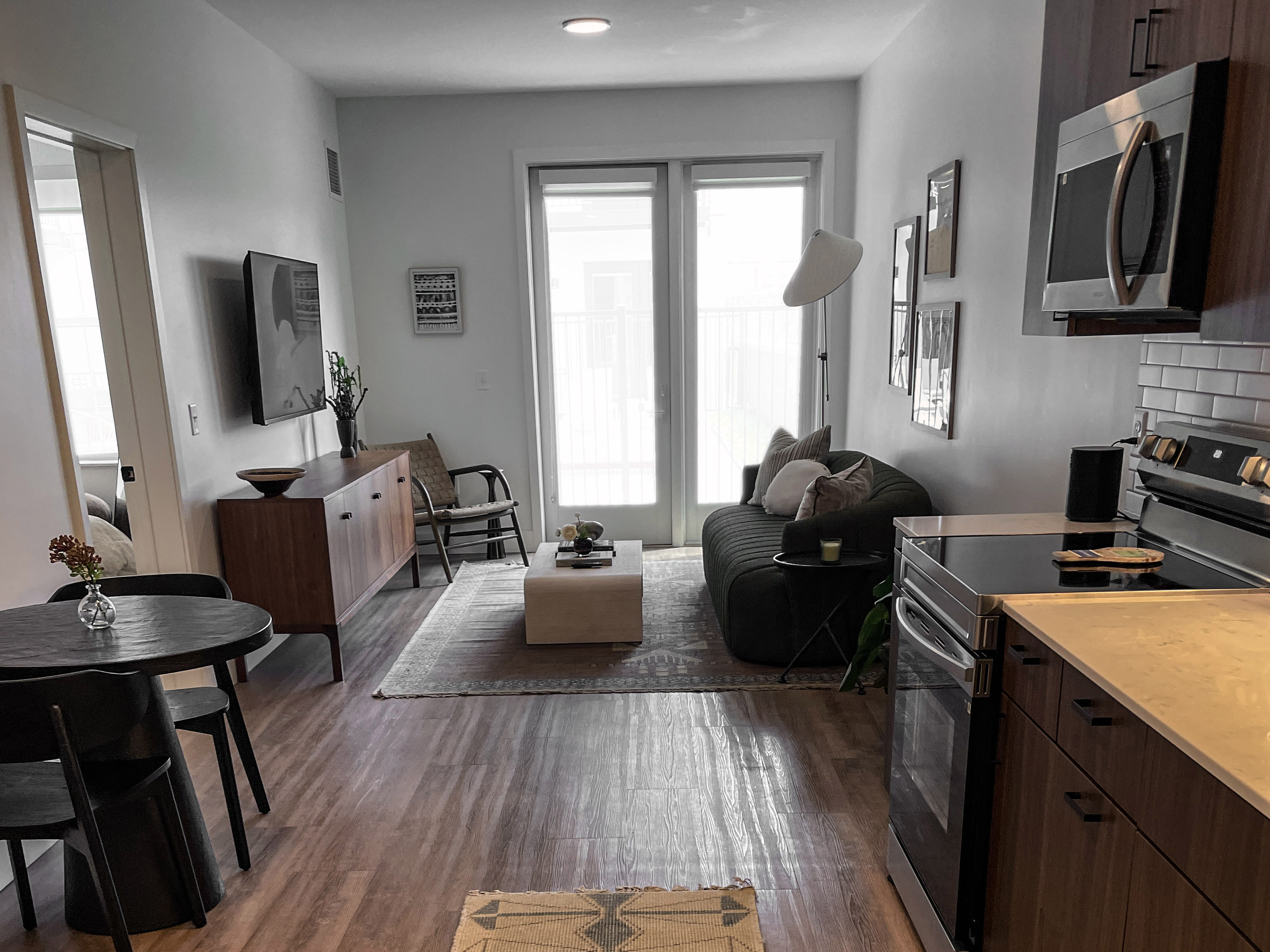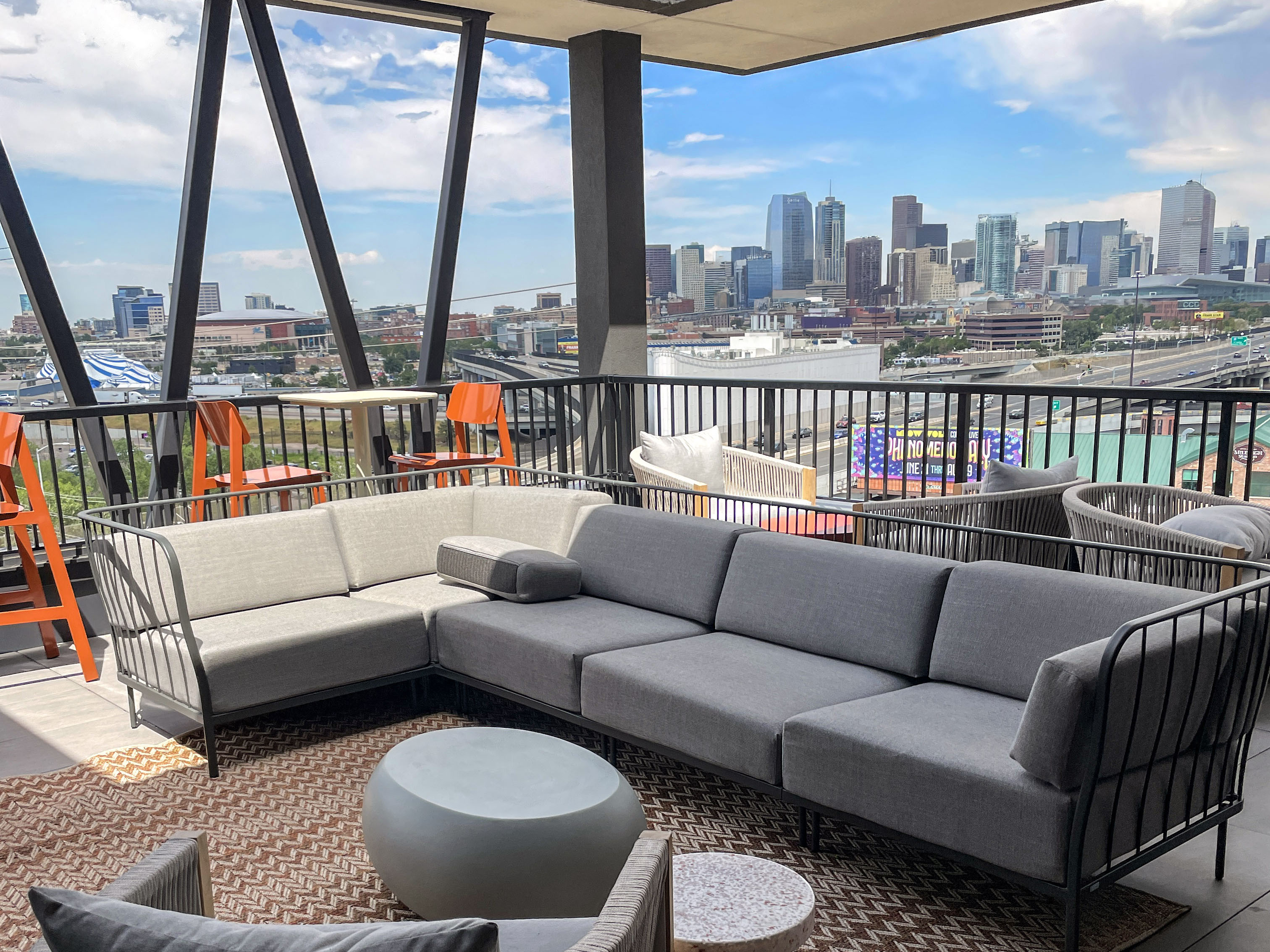 Live in a bright modern unit featuring huge windows and high-end finishes, a chef-style kitchens with quartz counters + stainless appliances, and premiere access to a rooftop deck with fire pits and epic views of the Front Range.