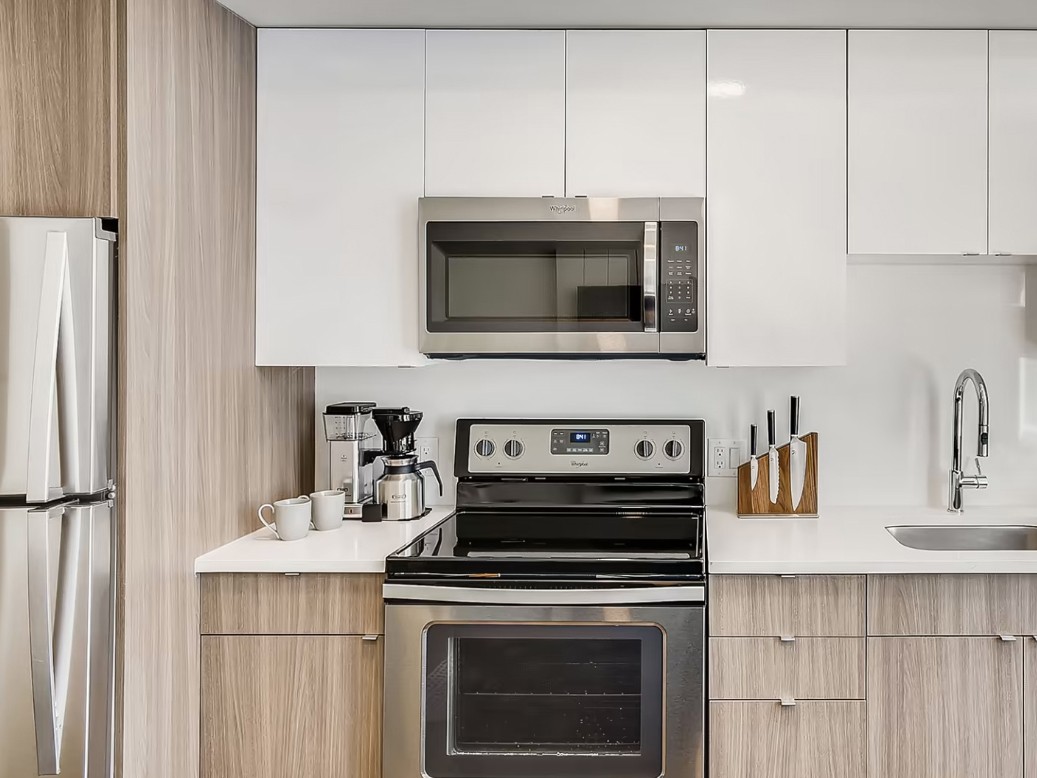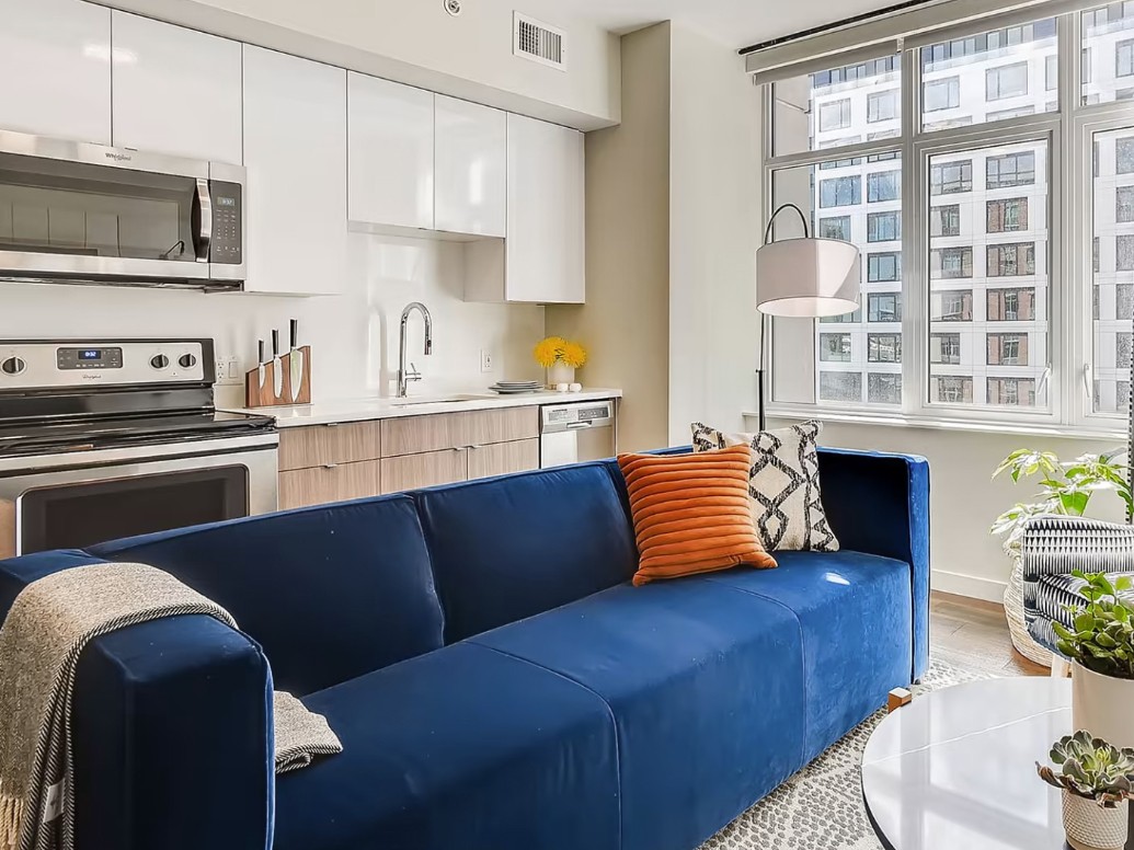 This apartment features an open-concept layout with floor-to-ceiling windows, gourmet kitchen with stainless steel appliances, quartz countertops, in-unit laundry, & smart home technology with keyless entry.