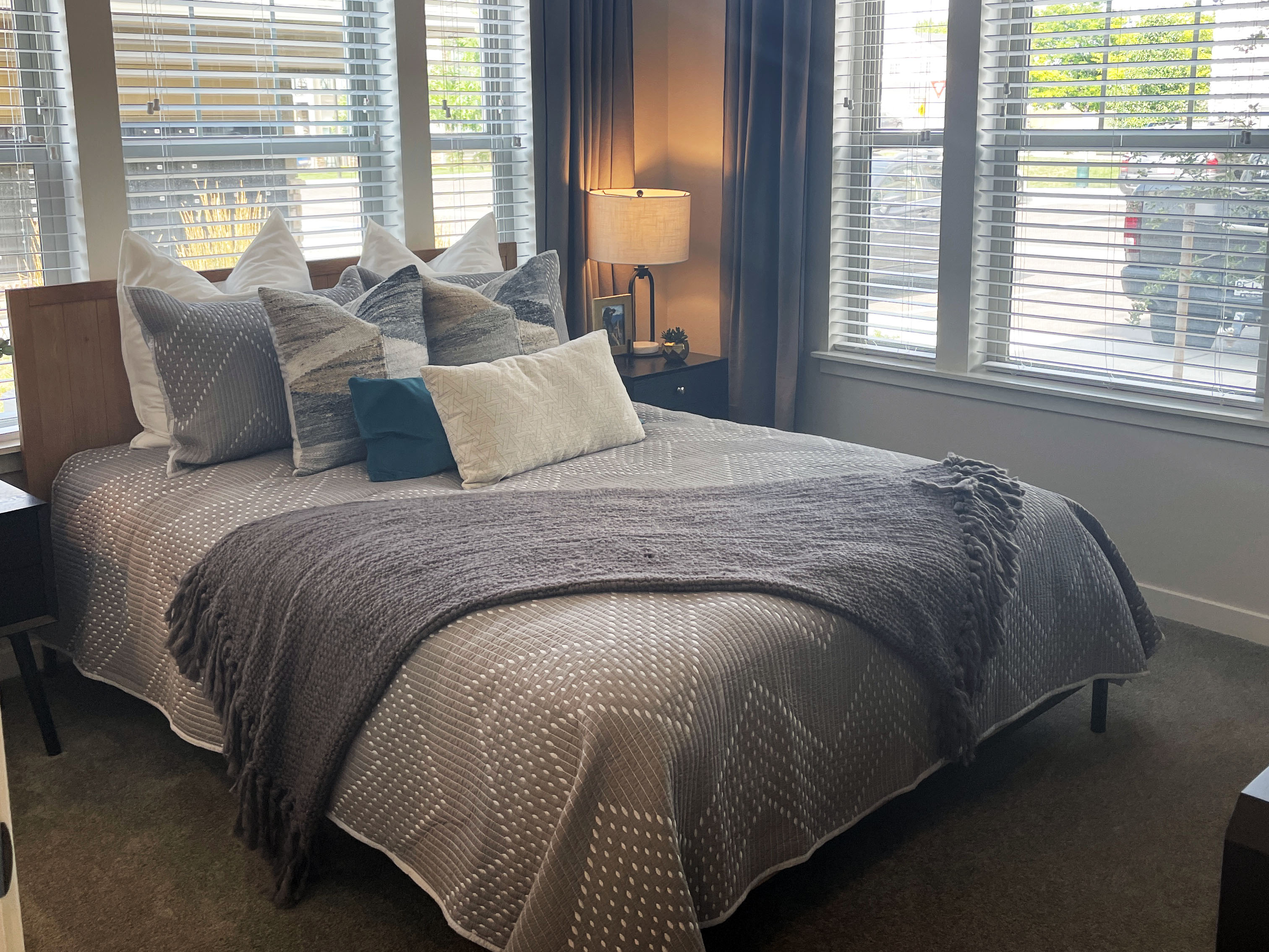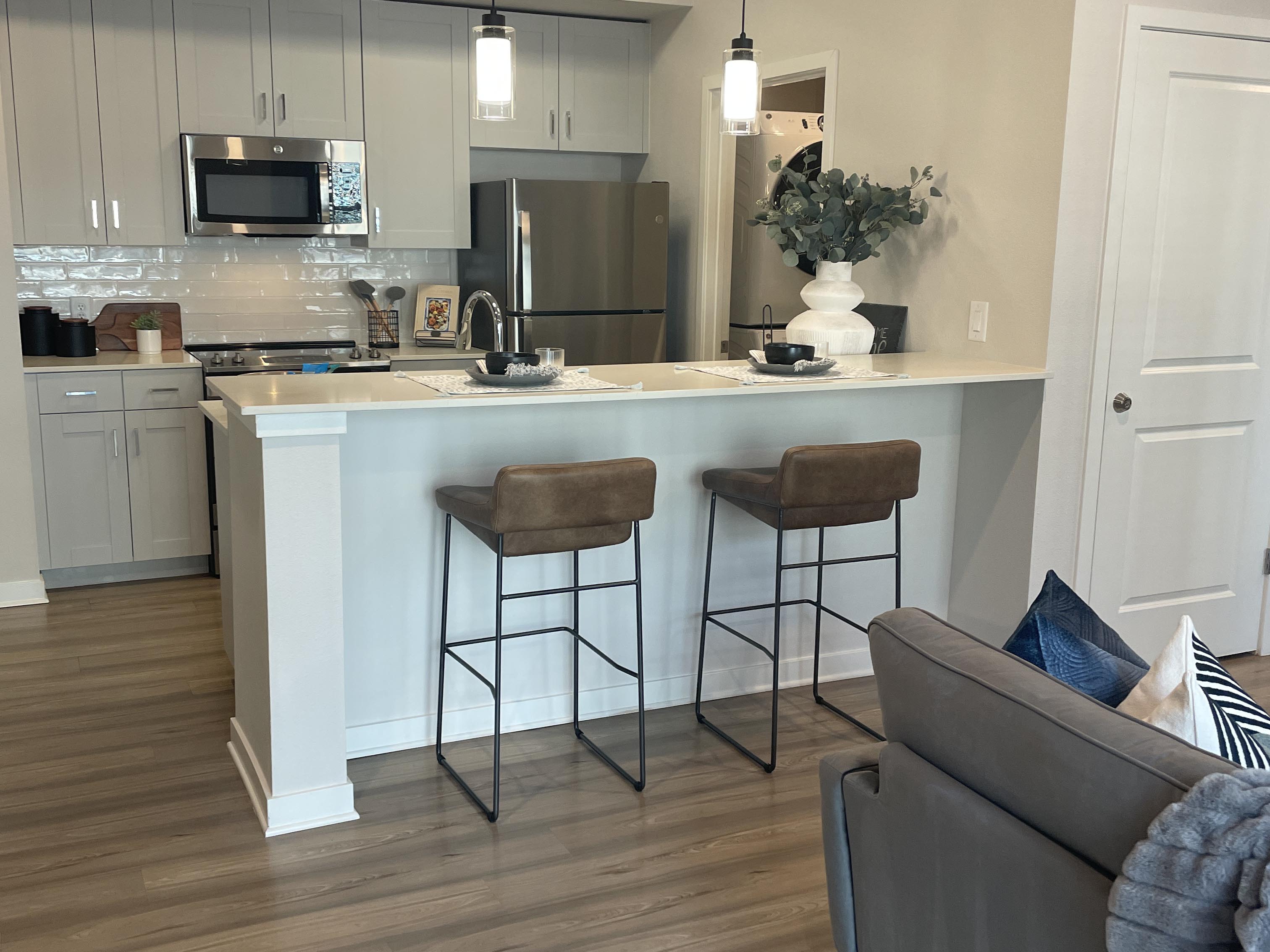 This apartment includes spacious, light-filled layouts with sleek finishes, a designer kitchen with quartz counters + stainless steel appliances, & in-unit laundry.