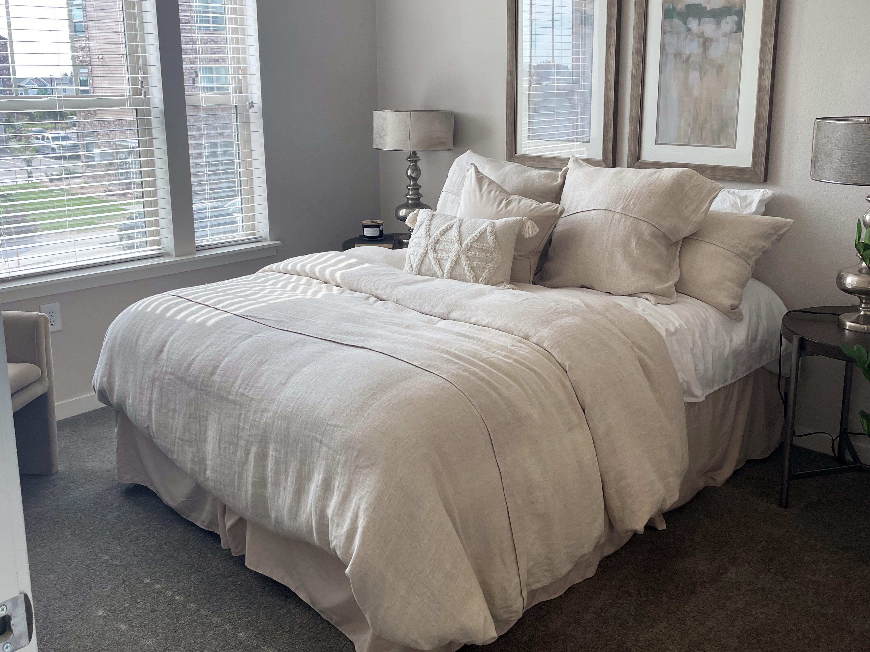 This apartment includes spacious, light-filled layouts with sleek finishes, a designer kitchen with quartz counters + stainless steel appliances, & in-unit laundry.
