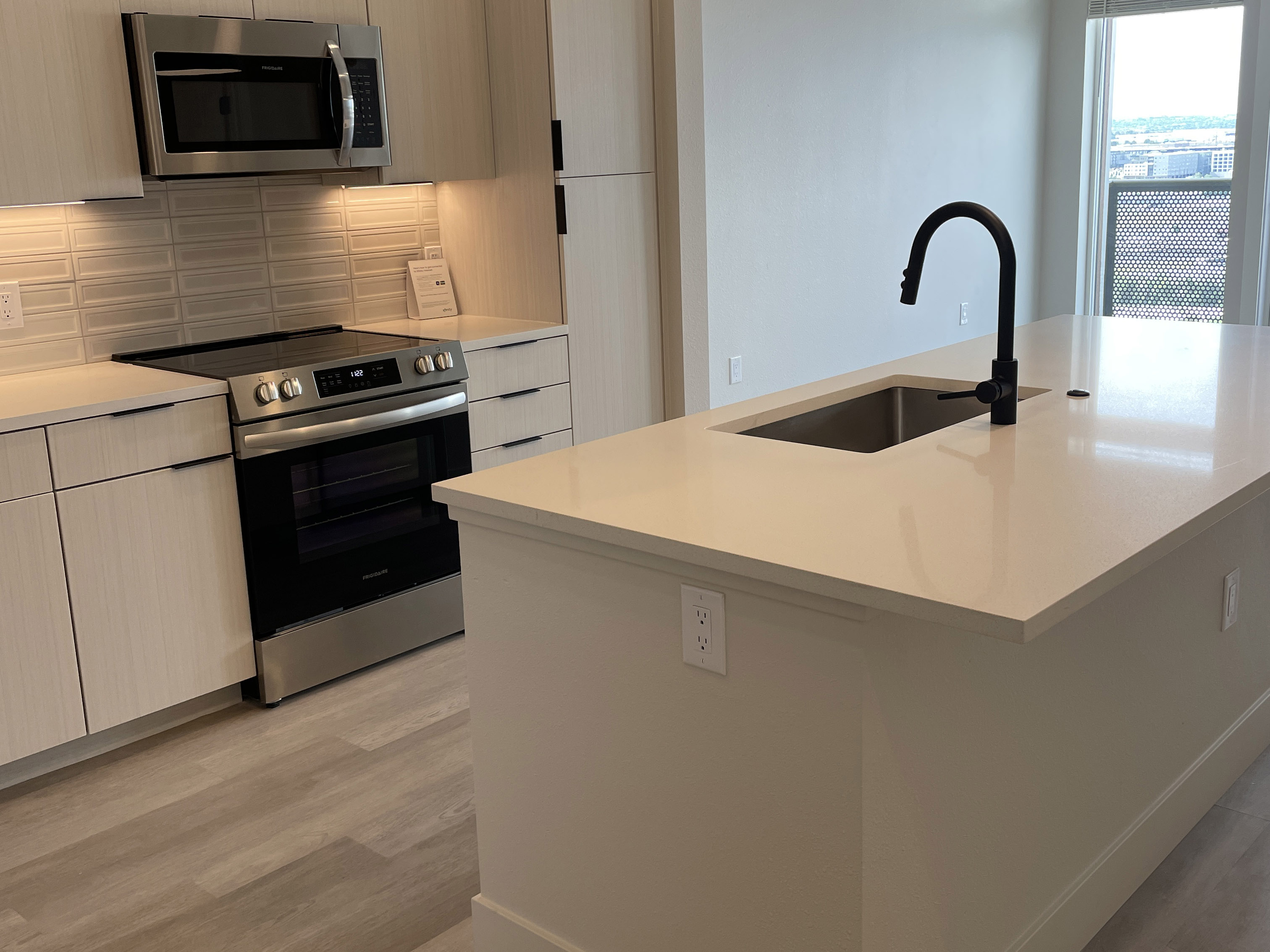 The unit includes sleek modern interiors with tall ceilings + oversized windows,an open-concept kitchen with quartz counters & stainless appliances, & in-unit laundry.