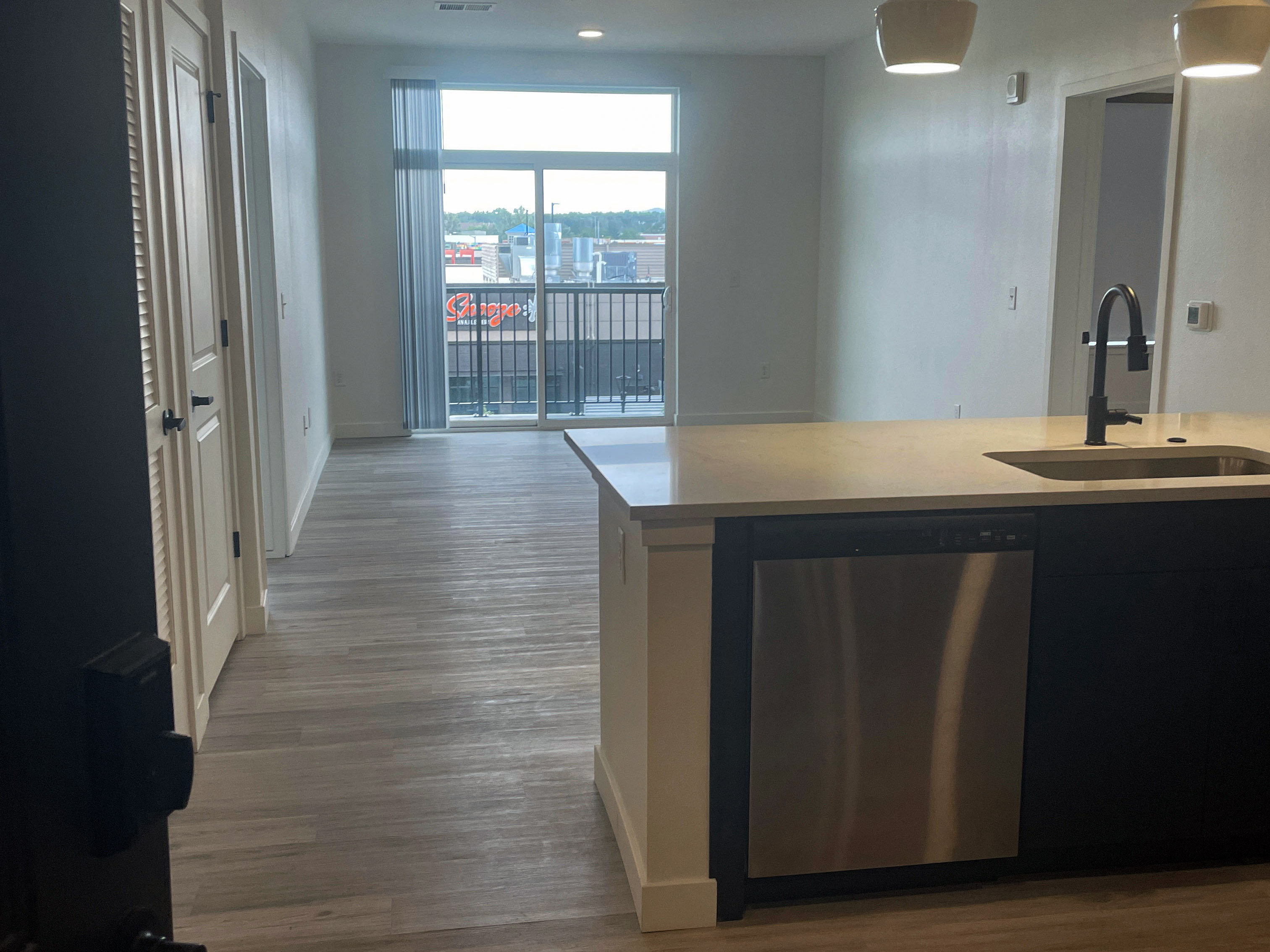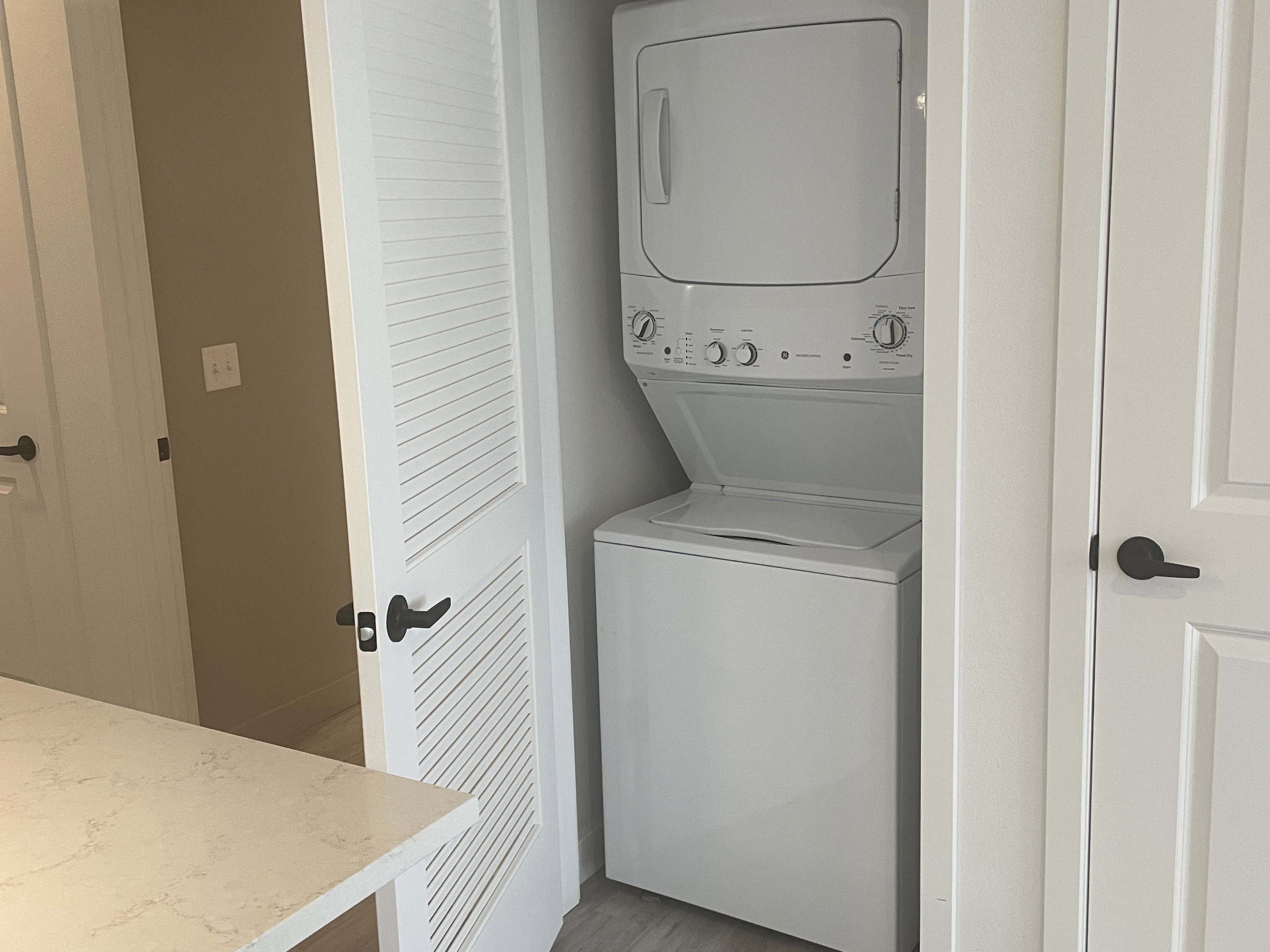 It features a super open layout with huge windows (all the natural light you could want), a modern kitchen with stainless steel appliances, quartz counters, and tons of cabinet space. Additions include in-unit laundry, a private balcony, & central air.
